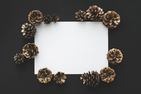 Pinecone frame at white background. Winter background. Christmas festive background.