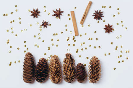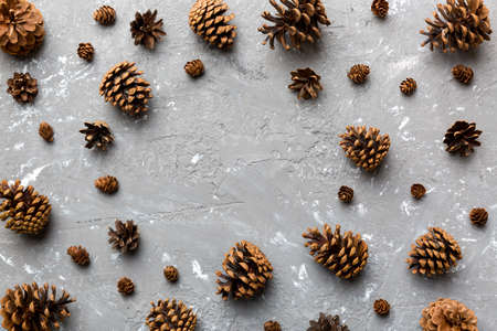 Christmas and Happy New Year background. Pine cones top view, copy space