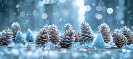 Festive winter background featuring pine cones and fir branches arranged on a snowy surface, creating a beautiful and natural holiday pattern