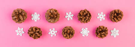 Top view of New Year ornament made of white snowflakes and pine cones on colorful background. Banner winter holiday concept with empty space for your design.