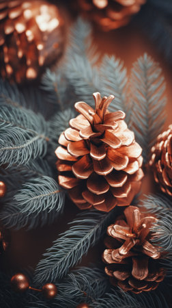 A close-up view presents a segment of a Christmas tree adorned with pine cones and twinkling lights. The tree's green needles contrast with the brown cones and golden lights, set against a soft, neutral backdrop. This visual could be utilized for holiday-themed advertising, editorials, or design projects.
