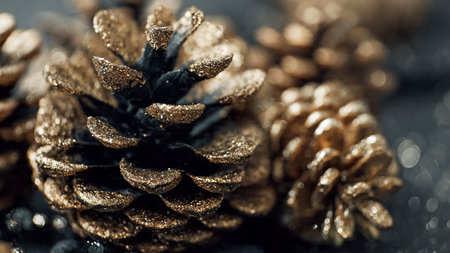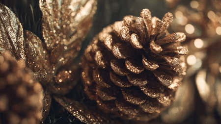 Holiday festive close-up of frosted pine branches adorned with glitter-covered pinecones. Warm, glowing bokeh lights sparkle in the background