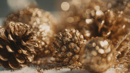 Christmas background with golden pine cones, shallow depth of field. Vintage toned