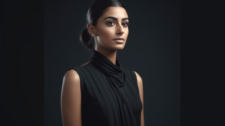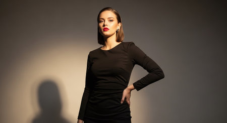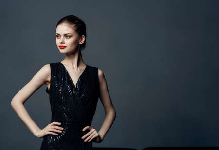 Portrait of a young beautiful woman in black dress. Studio shot.
