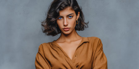A woman stands confidently with her arms crossed. She has short hair and bright blue eyes. The background is gray, creating a simple look. The lighting is soft and even.