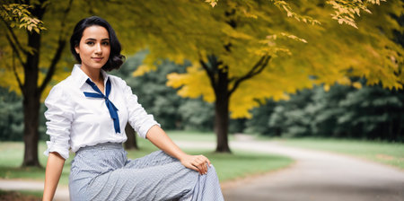 Portrait of a beautiful young brunette woman in a white blouse and beige skirt on the street.