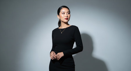 Portrait of a stunning fashionable beautiful sexy Asian woman in stylish strapless dress clothes with hand on chin and looking at camera. Fashion and beauty concept. Lady slim wears black fit clothes.