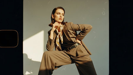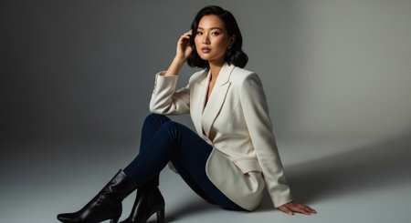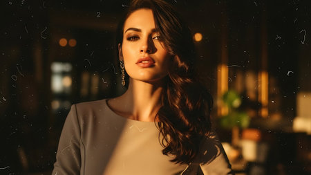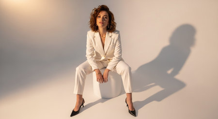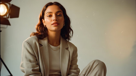A stylish woman in a beige blazer and satin top, posing confidently in front of a large softbox light, with a modern interior background