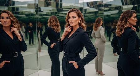 A woman in a tailored blue suit and yellow turtleneck, shown from two angles, exuding a confident and professional mood.