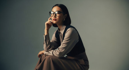 Portrait of a beautiful young woman in eyeglasses looking away while sitting on grey background