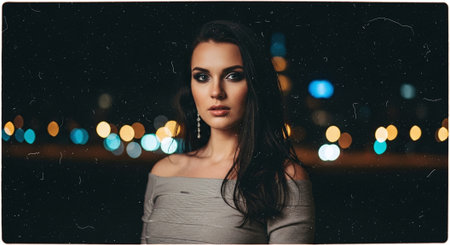 A woman with long dark hair wearing an off-shoulder top, standing against a blurred city lights background at night
