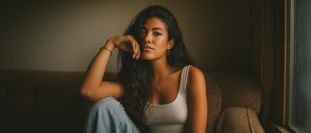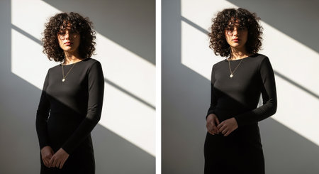 A woman stands in a sunlit space, gazing thoughtfully with soft shadows on her face. The warm light highlights her features, creating a serene atmosphere.