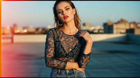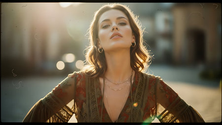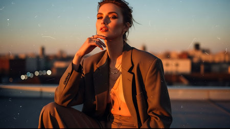 Portrait of beautiful young woman with makeup in fashion clothes posing outdoor