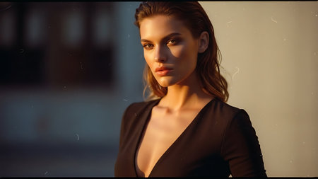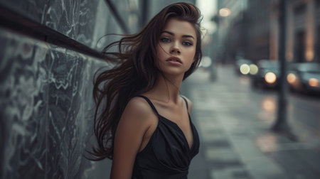 A woman in a black dress stands in front of a wall. She has long hair and is looking straight ahead. The image has a moody and mysterious feel to it