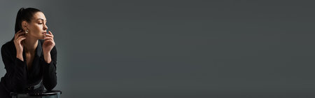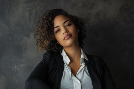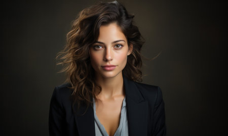 Contemporary portrait of a businesswoman in a dark suit against a textured gray background