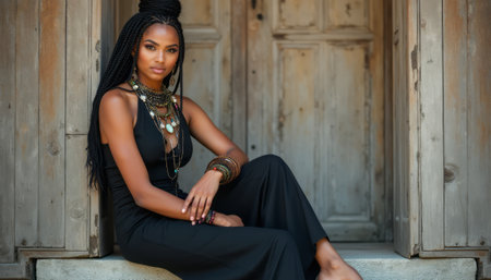 A stunning woman with long braids sits gracefully on a wooden step, adorned in a sleek black outfit and layered jewelry. Her poised demeanor and striking accessories create an atmosphere of elegance and strength, highlighting her unique beauty.