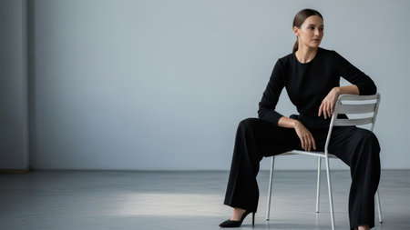 Young caucasian female in stylish black outfit seated on white chair in minimalist setting.