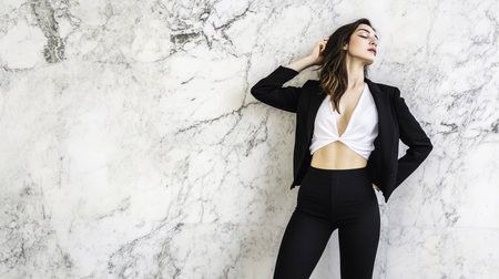 Beautiful girl in a black suit and a white T-shirt on a marble background