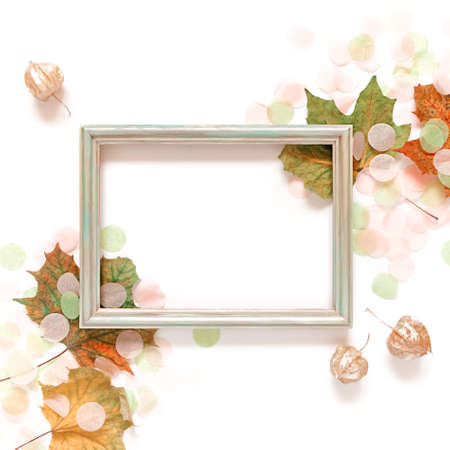 The empty wooden photo frame is on a white background and is decorated with dry maple leaves, physalis boxes and confetti. Autumn composition. Flat lay. Top view. Copy space.
