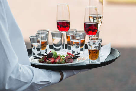 Catering services. Celebration. glasses with alcohol on a tray.
