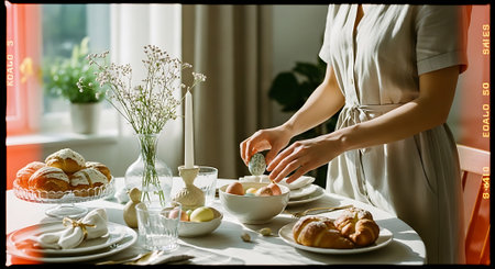 Woman decorating Easter table with different food. Selective focus.