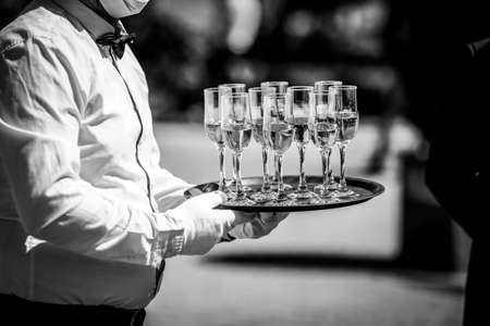 Shallow depth of field (selective focus) details with a waiter walking around and giving sparkling wine to the guests of an event.