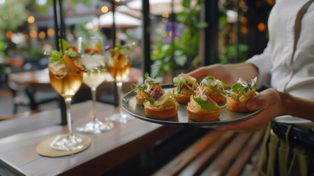 A server brings out a tray of delicate finger foods perfect for snacking on while sipping on refreshing mocktails