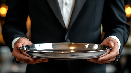 Waiter holding metal tray in restaurant, closeup. Catering service