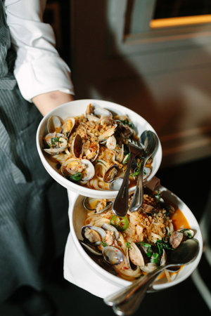 A server brings two bowls filled with seafood chowder topped with fresh clams to a dining table.