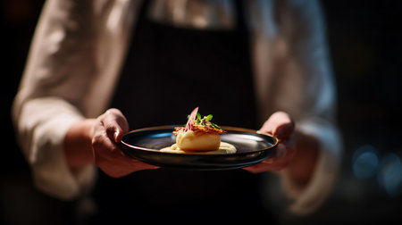close-up on the hand of a waiter carrying food duck steak with caramelized vegetables. Food styling and restaurant meal serving.