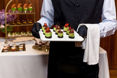 Waiter wearing black gloves carries snacks at a holiday event, party or wedding reception. Catering, waiter carries snacks on plates