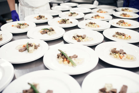 Prepped and ready for the waiters. plates being prepared for a meal service in a professional kitchen.
