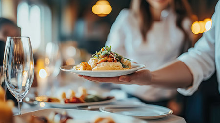 Table side service at a fine dining restaurant, Waiter serving dishes to the table
