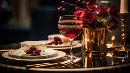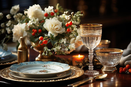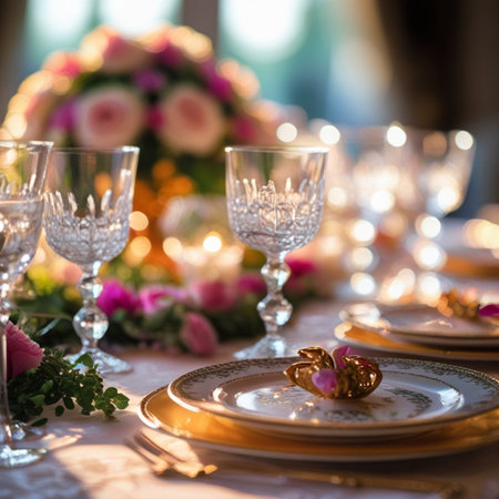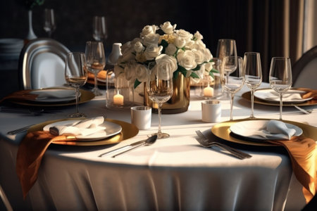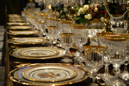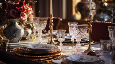 Luxury banquet table with ornate crockery, silverware, and crystal wineglass generated by artificial intelligence