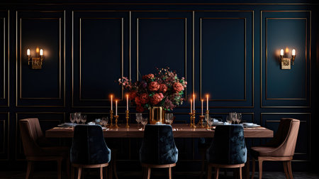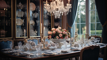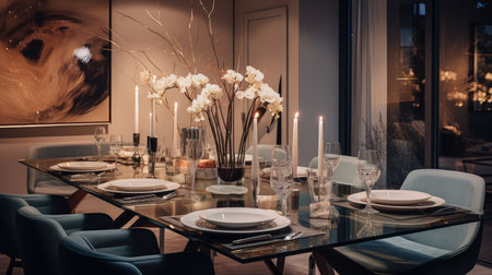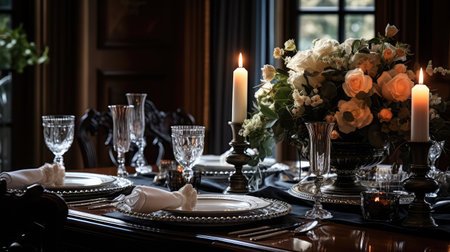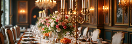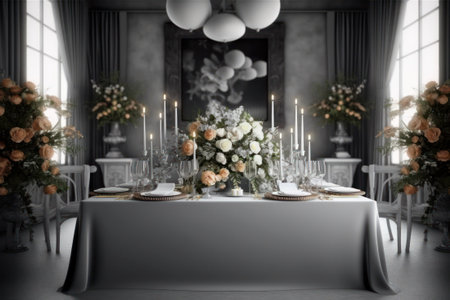 Elegant dining room with floral centerpiece and candles in luxurious setting. That the image is generated using AI