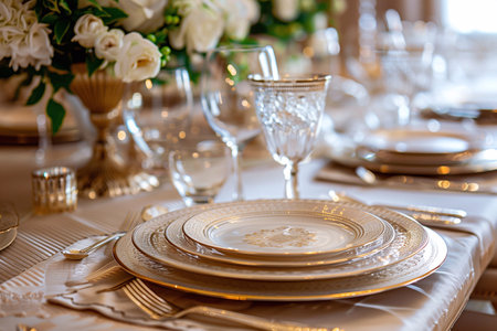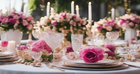 Table setting, harmonious combination of ornaments, dining for various events, wedding invitations, banquet christening, birthday parties. banner, copy space, background, text.