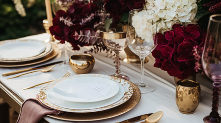 Wedding or formal dinner holiday celebration tablescape with hydrangea flowers in the English countryside garden, table setting and wine, floral table decor for family dinner party, home styling inspiration