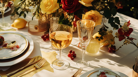 Luxury wedding celebration with elegant decoration, wine bottle and glasses generated by artificial intelligence