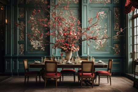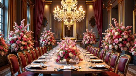 Elegant luxury dining room with floral arrangements and chandelier. That the image is generated using AI
