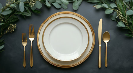 A table set with elegant gold and silver plates and silverware arranged meticulously, Elegant dishes and silverware arranged meticulously