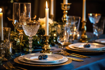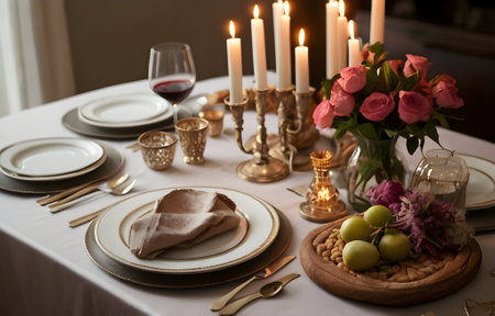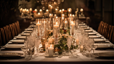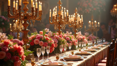 Elegant candlelit banquet table with floral centerpieces and fine tableware in lavish setting. That the image is generated using AI