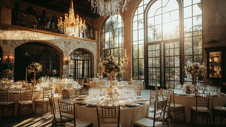 A beautifully arranged wedding reception featuring exquisite decor and a serene atmosphere.