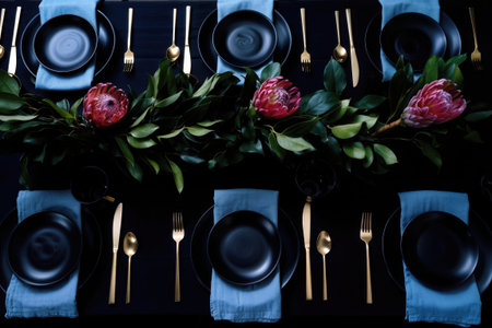 Elegant table setting with cutlery and flowers in restaurant, generative ai