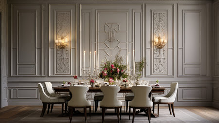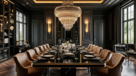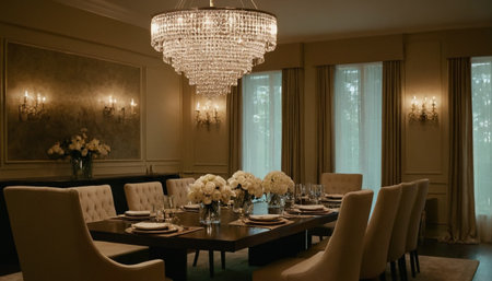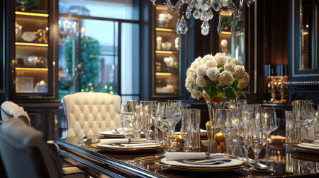 Formal luxury dining space with elegant proportions, soft lighting, and high-end materials