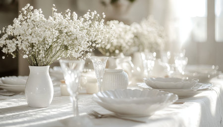 Elegant white themed casual wedding dinner with beautiful dishes and decorations