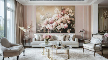 A beautifully designed modern living room featuring elegant furniture and stunning floral artwork. The soft color palette and natural light create a cozy, inviting atmosphere perfect for relaxation.