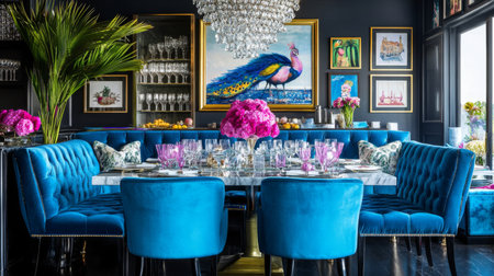 Luxurious living room featuring plush blue seating around a marble dining table. Vibrant floral arrangements and unique art pieces enhance interior design, exuding elegance and style.