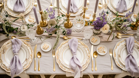 Elegant wedding table with floral centerpiece, gold accents and purple lavender details