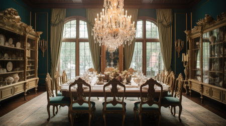 Interior design inspiration of Traditional Glamorous style home dining room loveliness decorated with Velvet and Gold material and Chandelier .Generative AI home interior design .