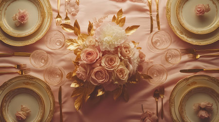 Aesthetically designed table with antique china and gold cutlery. Festive dinner concept. View from above. Generative AI